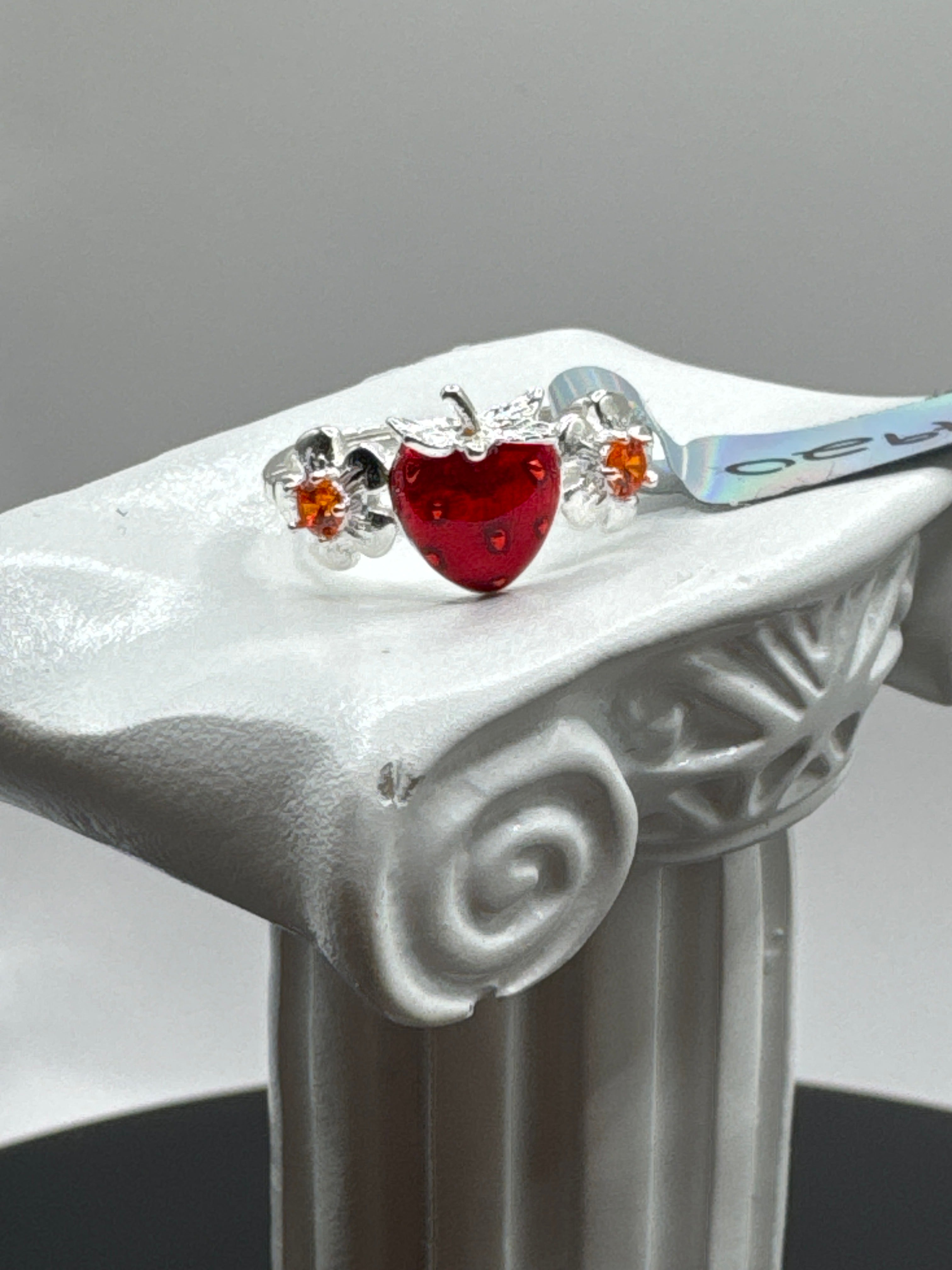This elegant ring features delicate flowers and a sweet strawberry in the center, crafted from high-quality silver .925. A perfect accessory for any occasion, this ring is sure to elevate any outfit with its intricate design and timeless appeal. Add a touch of sophistication and charm to your look with this stunning piece. Size 7